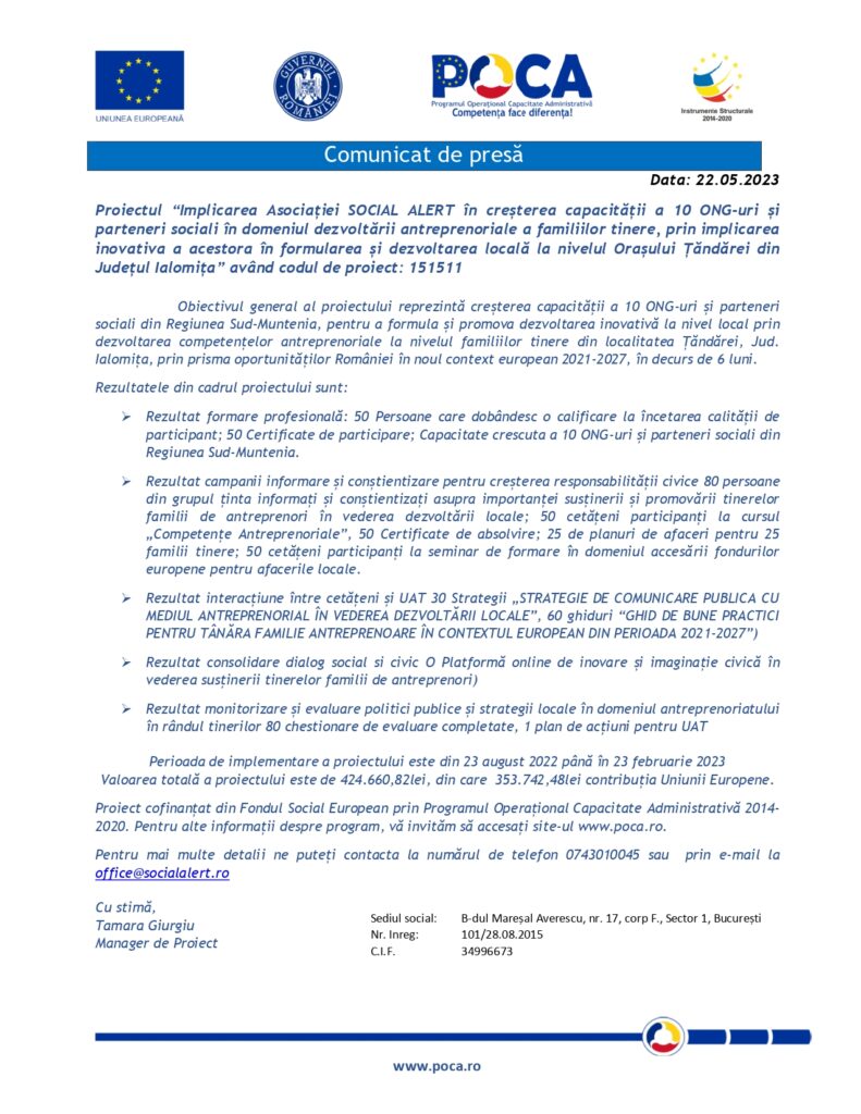Proiectul “Implicarea Asociației SOCIAL ALERT în creșterea capacității a 10 ONG-uri și parteneri sociali în domeniul dezvoltării antreprenoriale a familiilor tinere, prin implicarea inovativa a acestora în formularea și dezvoltarea locală la nivelul Orașului Țăndărei din Județul Ialomița” având codul de proiect: 151511