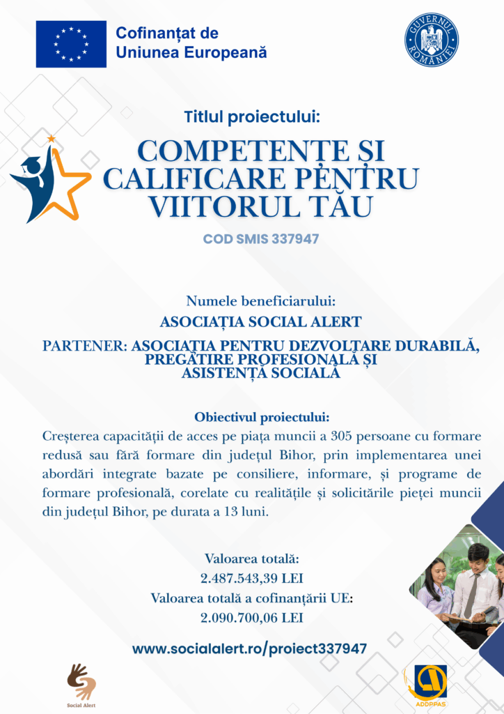 Cod MySMIS: 337947 | Cod apel: PEO/382/PEO_P9/OP4/ESO4.7/PEO_A35 | Fond: FSE+ | Operațiune: „Pachet de bază pentru persoanele fără/cu nivel scăzut de formare”.